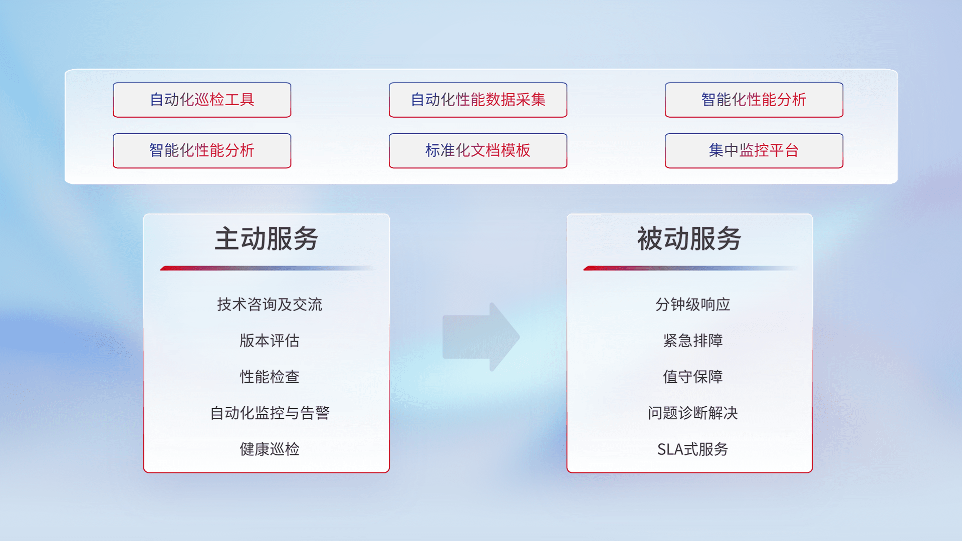 智能化工具和标准化文档,,保障服务质量,,,,提供主动服务(包含技术咨询、、、版本评估、、、、性能检查、、、、自动化监控与告警、、、健康巡检)和被动服务包含(分钟级响应、、、、紧急排障、、值守保障、、、问题诊断解决、、SLA服务)。。。。